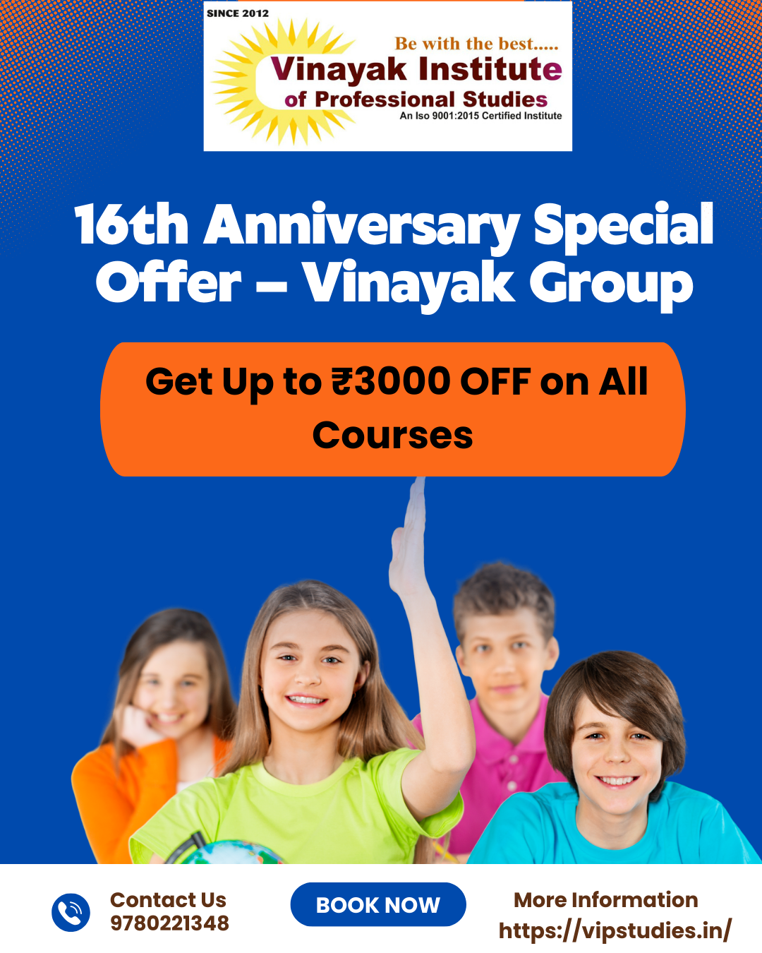 Celebrate the 16th Anniversary of the Vinayak Group with a special learning opportunity at Vinayak Institute of Professional Studies. As part of the anniversary celebration, students can get up to ₹3000 OFF on all courses for a limited time. This special offer is available on popular professional programs such as Computer Courses, Digital Marketing, Tally, Advanced Excel, ADCA, and Spoken English. It is a great chance for students after 10th, 12th, or graduation to upgrade their skills and build a better career at an affordable fee. Visit our institute in Pathankot and take advantage of this anniversary offer before it ends.